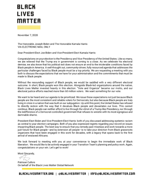BLM Co-founder Patrisse Cullors sent a letter to former vice president Joe Biden and his Vice Presidential Nominee Kamala Harris congratulating them on winning the presidential election and demanding a meeting to discuss BLM’s “expectations” for their administration.