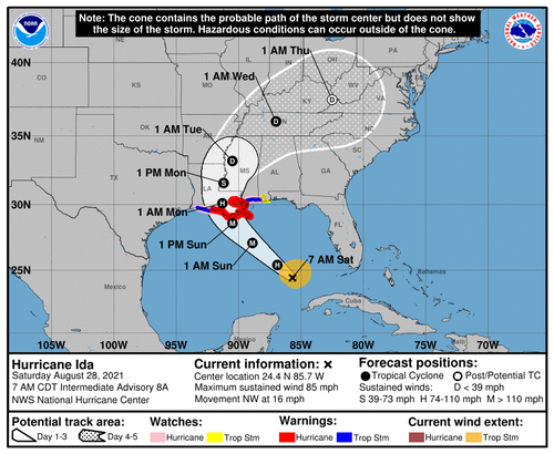 “Ida is expected to be an extremely dangerous major hurricane when it approaches the northern Gulf Coast on Sunday,” NHC said Saturday morning. At 0500 ET, the storm sustained maximum winds of 80 mph.