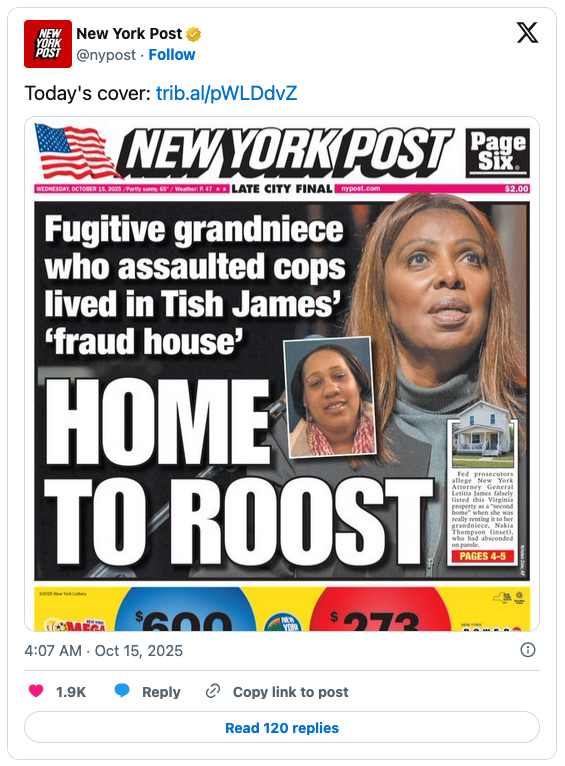 The estimable individual is cop-assaulter Nakia Thompson, who is wanted in North Carolina for absconding from parole. Bonus fact: Thompson is Letitia James’ grandniece.