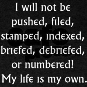 As long as we hold true to our desire to be an individual, we can carve a small sphere of independence for ourselves, but all around us will still be the Society, the Village, waiting for us to give in, to become another faceless number, placidly controlled in the very beautiful but very deadly Village of live.
