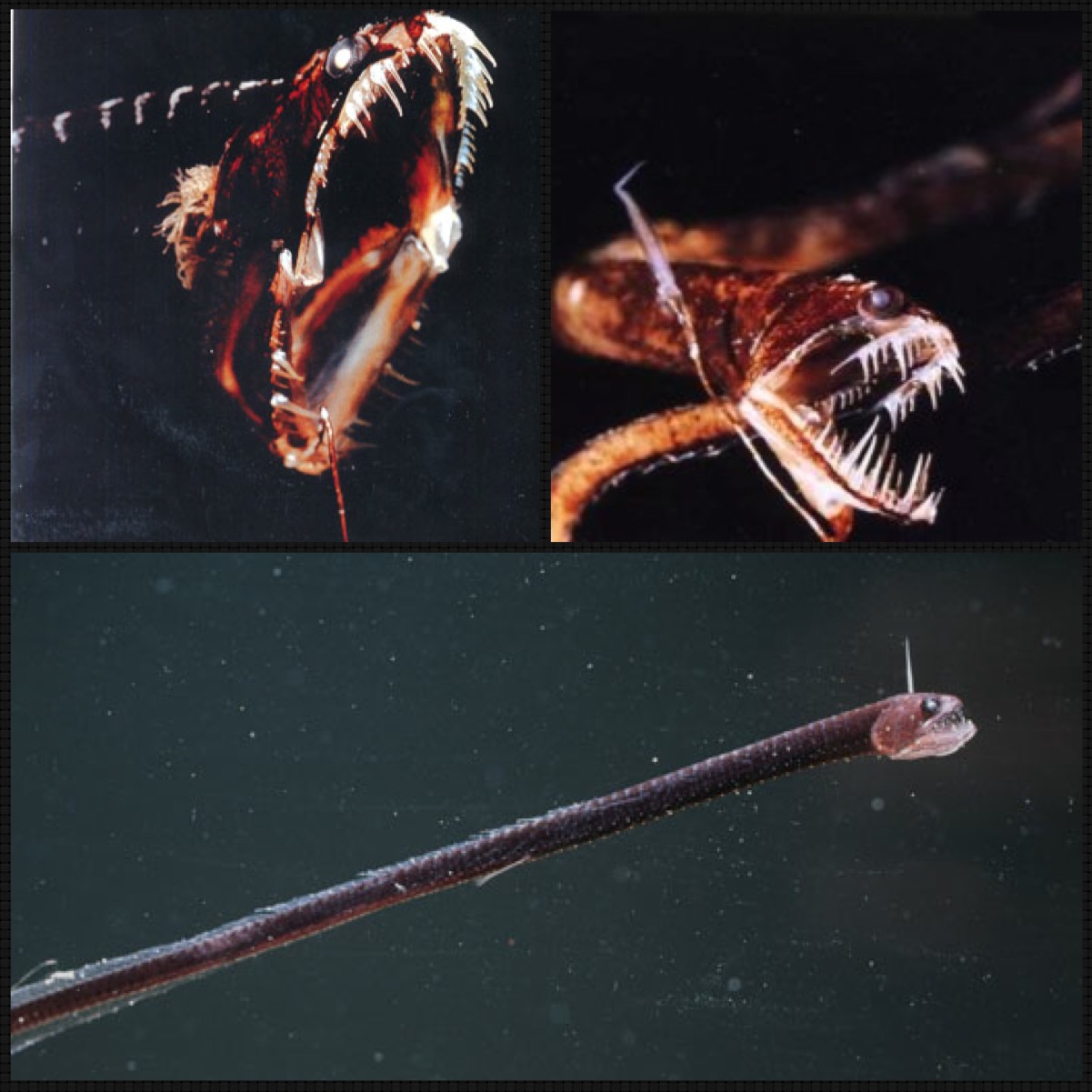 Built for ramming speed the Viperfish has a special vertebrae on its back to absorb high-velocity impact, due to its reckless hunting method. It tends to rush its victims, impaling them on its protruding fangs, then gnawing them away at its leisure.